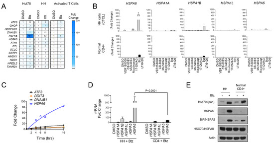 HSPA6 is a biomarker of response to Btz in CTCL cells. (A) Hut78, HH, and normal CD4+ T cells were treated with Btz for 16 h. RT-qPCR using primers for the indicated transcripts was conducted. Data were normalized to GAPDH (internal control) and DMSO-treated (treatment control) groups. (B) HH and normal CD4+ T cells were treated with an EC50 dose of the indicated ER stress-inducing drugs. RT-qPCR data for the indicated HSP70 isoform gene transcripts are shown. Data are expressed as average fold change ± SEM after normalization to GAPDH (internal control) and DMSO (treatment control). (C) HH cells were treated with Btz (10 nM) and expression levels of the indicated UPR genes were measured over time via RT-qPCR. Data are presented as fold change. (D) HH and normal CD4+ T cells were treated with Btz (20 nM) for 16 h. RT-qPCR data using primers for the indicated HSP70 isoform transcripts are shown. Statistical significance was determined using Student’s t-test (N = 3). (E) HH and normal CD4+ T cells were treated with Btz (20 nM) for 24 h. Western blots for the indicated HSP70 proteins are shown.