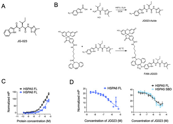 Previous studies have identified Hsp70 isoform-selective inhibitors that target the substrate-binding pocket of the canonical human HSP70s with >100-fold selectivity for HSPA5 and HSPA6 compared to other isoforms [30]. Compound 35 from this series of analogs (herein referred to as JG-023; Figure 3A) showed selectivity for HSPA5 (also known as BiP or GRP78) and HSPA6. To further characterize the binding of JG-023 to HSPA5 and HSPA6, we generated a fluorescently labeled derivative, FAM-JG-023, using a copper-free click chemistry strategy (Schema in Figure 3B). We then titrated HSPA5 and HSPA6 against a fixed concentration (20 nM) of FAM-JG-023 in a fluorescence polarization (FP) assay to determine binding specificity and potency (Figure 3C). Competition binding assays were conducted using parent (unlabeled) JG-023 to displace FAM-JG-023 from full-length HSPA6 and HSPA5 and a truncated version of HSPA5 that encompasses the substrate-binding domain (SBD) mapping to amino acids 420–500 (Figure 3D). Unlabeled JG-023 successfully competed away FAM-JG-023 binding to HSPA6, HSPA5 FL, and HSPA5 SBD in a dose-dependent manner with IC50s of 0.5 ± 0.3, 1.3 ± 0.2, and 1.4 ± 0.06, respectively, confirming that JG-023 and FAM-JG-023 bound to the same binding pocket with specificity and good potency for an early-stage lead compound.