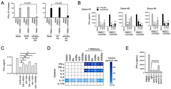 Th2 cytokines play a key role in allergic responses and in defense and wound repair following helminth parasite infection [49,50]. They accomplish this in part by suppressing Th1 cytokines such as IFNγ and tipping the Th1/Th2 balance toward a Th2 bias [51]. Under normal conditions, Th2 immunity counterbalances Th1 immunity [52]. Under pathological conditions like CTCL, Th2 immunity has been proposed to induce global and local T-cell suppression in patients with CTCL [53]. Given the paucity of Th1 cells in CTCL lesions, we hypothesized that CTCL-derived secreted factors suppress normal Th1 cell activity. To test this, we activated naïve T cells from normal human donor PBMCs using a trimeric anti-CD3/CD28/CD2 antibody in the presence of conditioned media (CM) from HH and Hut78 CTCL cells. The activation of Th1-cell populations in PBMCs was measured using IFNγ production as a proxy. We found that CM from stimulated HH and Hut78 cells significantly repressed IFNγ production following the activation of normal T cells from three separate normal human donors in a dose-dependent manner (Figure 6A,B). Suppressive factors from CTCL cells exhibited high apparent potency with effects evident even when CM was diluted 50-fold (Figure 6B).