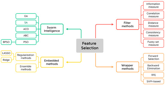 Overall categories of feature selection techniques. RFE: recursive feature elimination; SVM: support vector machines; LASSO: least absolute shrinkage and selection operator; GA: genetic algorithms; SA: simulated annealing; ACO: ant colony optimization; ABC: artificial bee colony; PSO: particle swarm optimization; BPSO: binary particle swarm optimization.