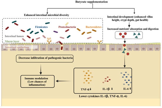 One of the most notable advantages of butyrate supplementation is its ability to promote healthy gut microbiota, which are vital for optimal growth and health. Specifically, butyrate increases microbial diversity and supports the growth of beneficial bacteria such as Firmicutes, Bacteroides, Prevotella, and Ruminococcus, while simultaneously reducing harmful pathogens like Proteobacteria and Escherichia/Shigella [13,14]. This beneficial modulation of the gut microbiota is particularly significant during early intestinal development in animals, when microbial diversity is critical for establishing a robust digestive system.