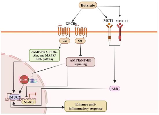 Butyrate’s role in promoting anti-inflammatory response. Butyrate via monocarboxylate transporter 1 (MCT1) and sodium-coupled monocarboxylate transporter 1 (SMCT1) activate aryl hydrocarbon receptor (AHR) to promote anti-inflammatory response.