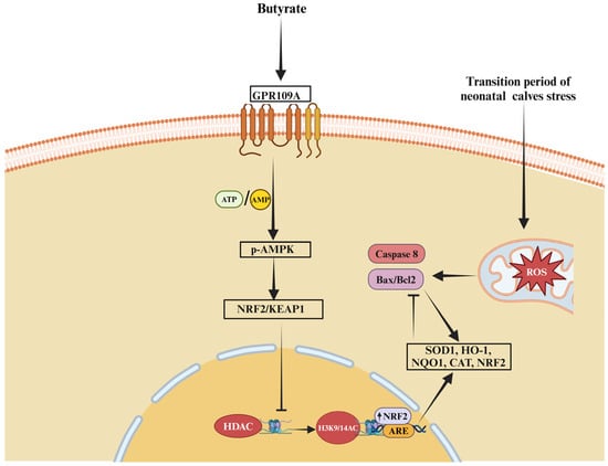The antioxidant role of butyrate in promoting animal health. Butyrate alleviates stress in high-yielding dairy cows through the GPR109A/AMPK/NRF2 signaling pathway and H3K9/14 acetylation. Furthermore, NRF2 nuclear accumulation and H3K9/14 acetylation enhance antioxidant and anti-apoptotic effects in bovine mammary epithelial cells.