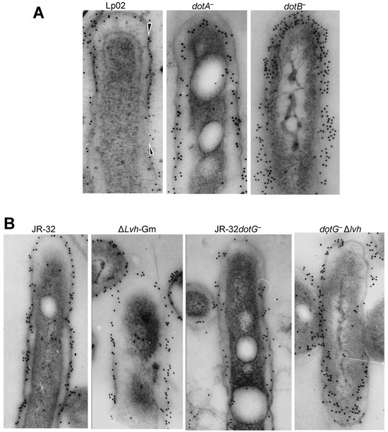 Electron micrographs of ultrathin sections of the L. pneumophila parent strains and mutants (indicated on top of each panel), immunolabeled with HtpB-specific hyperimmune serum and anti-rabbit goat IgG conjugated with gold spheres. (A) Side-by-side comparison of sectioned Lp02, dotA− mutant, and dotB− mutant. Arrowheads point at a row of gold particles lining the outer membrane of Lp02. (B) Side-by-side comparison of sectioned JR-32, Δlvh-Gm mutant, JR-32dotG− mutant, and dotG−Δlvh double mutant. For size reference, gold spheres are ~10 nm in diameter.