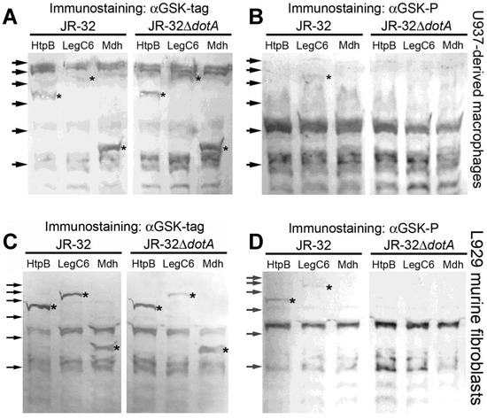 To test whether or not the translocation of HtpB to the cytoplasm of mammalian host cells requires a functional Dot/Icm system, GSK-tagged derivatives of JR-32 and JR-32ΔdotA were used to infect U937-derived human macrophages. The three tagged proteins were detected in lysates of infected cells immunostained with αGSK-tag, indicating that the recombinant proteins were expressed in host cells (Figure 7). However, the detection of GSK-LegC6 (positive translocation control) was obscured by adjacent cross-reactive protein bands from U937 cells (Figure 7A). Immunostaining with the αGSK-P antibody only exposed a faint band of phosphorylated GSK-LegC6 (Figure 7B).
