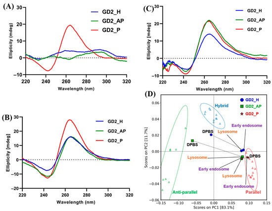 To confirm the G-quadruplex topology, we measured the CD spectrum in DPBS, which simulates physiological ion concentrations of the cell culture medium. At 37 °C in DPBS, GD2_H exhibited a CD spectrum with a negative peak around 240 nm, a broad positive peak around 260 nm, and another positive maximum around 290 nm (Figure 2A), characteristic of a hybrid G4 topology [32]. GD2_AP displayed a negative minimum around 260 nm and a positive maximum around 290 nm, indicating an anti-parallel topology [33]. Conversely, GD2_P showed a parallel topology with a negative minimum at 240 nm and a positive maximum at 260 nm [33]. All of the G4 CpG ODNs were found to maintain their respective topologies also at a room temperature of 25 °C (Supplementary Figure S8). CD spectra were also obtained under conditions mimicking the intracellular environment. Although the three G4 CpG ODNs displayed different topologies in DPBS, all three exhibited spectra with a positive maximum of around 260 nm and a negative minimum of around 240 nm in early endosomal and lysosomal conditions (Figure 2B,C). A visual and subjective judgment is employed to determine the topology of G4 based solely on the shape of the CD spectrum. The topology of G4 nucleic acids can be evaluated objectively and quantitatively by using PCA based on CD spectra of G4 structures with known 30 structures [16,34]. GD2_H, GD2_AP, and GD_P were not within the ellipse because of the long random insertion in the second loop of G4, affecting the whole CD spectrum. PCA score plots confirmed that GD2_H, GD2_AP, and GD2_P formed hybrid, anti-parallel, and parallel structures, respectively, in DPBS (Figure 2D). Moreover, PCA indicated that all three G4 CpG ODNs adopted parallel topologies under conditions simulating early endosomes and lysosomes. These findings demonstrated that all three types of G4 CpG ODNs maintained their topology in the medium. After cell uptake, the topologies of GD2_H and GD2_AP changed into the parallel type within the endosome.