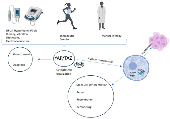 - Pan, C.; Hao, X.; Deng, X.; Lu, F.; Liu, J.; Hou, W.; Xu, T. The roles of Hippo/YAP signaling pathway in physical therapy. Cell Death Discov. 2024, 10, 197. [Google Scholar] [CrossRef] [PubMed] [PubMed Central]