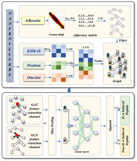 Several machine learning approaches have been developed in recent years to predict IL-6-inducing peptides. Dhall et al. introduced IL-6Pred, which uses 15 peptide feature descriptors to map sequences to feature vectors, and then input them into a random forest model for prediction [10]. To further improve predictive performance, Charoenkwan et al. proposed StackIL6, a stacked ensemble model that combines three primary peptide features with five well-known traditional machine learning models [11]. By fine-tuning the hyperparameters of individual classifiers, StackIL6 significantly enhances both recognition accuracy and generalization capabilities. However, machine learning-based methods heavily rely on extensive human driven feature engineering and domain expertise. Deep learning approaches have also advanced the prediction of IL-6-inducing peptides. MVIL6, a deep learning-based predictor, leverages peptide sequence information by combining the Transformer architecture with the pre-trained MG-BERT model, effectively extracting feature representations and improving recognition performance [12]. Despite these promising advancements, existing studies largely overlook the structural features of IL-6-inducing peptides, which are crucial for their functional roles [13,14,15,16].