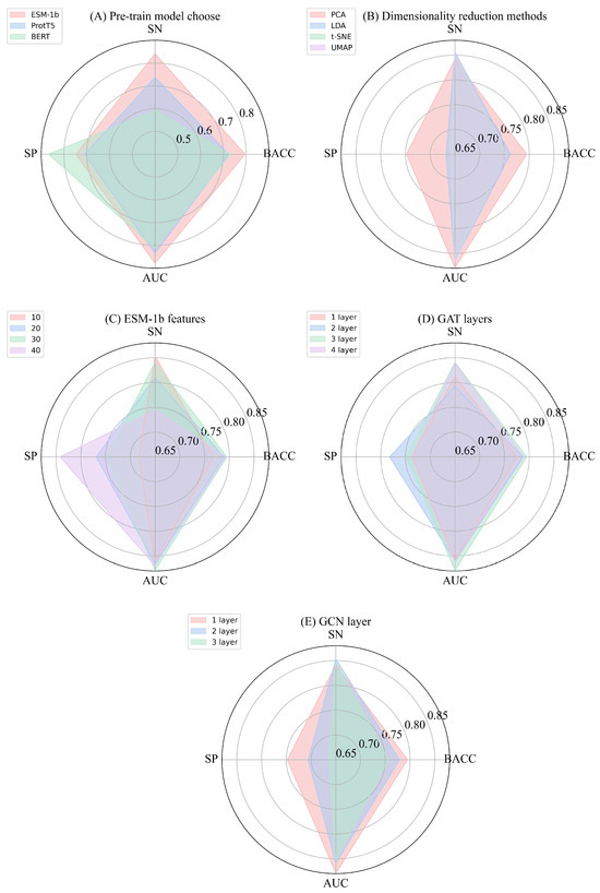 In the process of selecting the pre-trained models, we conducted a five-fold cross-validation and compared the performance of BERT [32], ProtT5 [33], and ESM-1b models. Since these models extract feature vectors of different dimensions, we performed dimensionality reduction on the features before conducting the comparative experiments. As shown in Figure 4A, the ESM-1b model outperformed the others in terms of evaluation metrics such as AUC, BACC, and SN. This can be attributed to the fact that, although BERT and ProtT5 excel in capturing long-range dependencies and contextual information, the relatively short sequences in our study may limit their performance. In contrast, ESM-1b is capable of capturing the position and relative importance of amino acids in three-dimensional structures by considering their deep features. This ability not only enhances our understanding of how amino acids interact with each other but also provides insights into their functional roles within peptide segments. The deep features enable the model to identify the importance of key amino acid positions for biological activity, thereby improving prediction accuracy. After carefully considering both the experimental results and the model characteristics, we ultimately selected ESM-1b as the pre-trained model for our study.