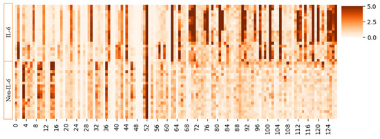 To visually demonstrate the features extracted by different channels of the DGIL-6 model, we conducted a hierarchical clustering analysis after concatenating the features from the GAT and GCN channels. Hierarchical clustering was selected because it effectively groups similar features into a hierarchical structure, facilitating a clear observation of feature similarity. This method is particularly well suited for exploring the intrinsic structure of data and identifying feature patterns. The visualization helps to quickly pinpoint similar features and provides insight into their distribution and significance across the entire dataset. The results of the hierarchical clustering analysis [39] are presented in Figure 7. As shown in the characteristic distribution of IL-6-inducing peptides and non-IL-6-inducing peptides in Figure 7, regions with larger eigenvalues tend to form clusters. This finding suggests that features derived from the model are similar for sequences with similar functions but significantly different for sequences with distinct functions. It is noted that larger eigenvalues indicate that these features play a more significant role in distinguishing different categories.