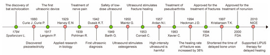 - Maintz, G. Animal Experiments in the Study of the Effect of Ultrasonic Waves on Bone Regeneration. Strahlentherapie 1950, 82, 631–638. [Google Scholar] [PubMed]