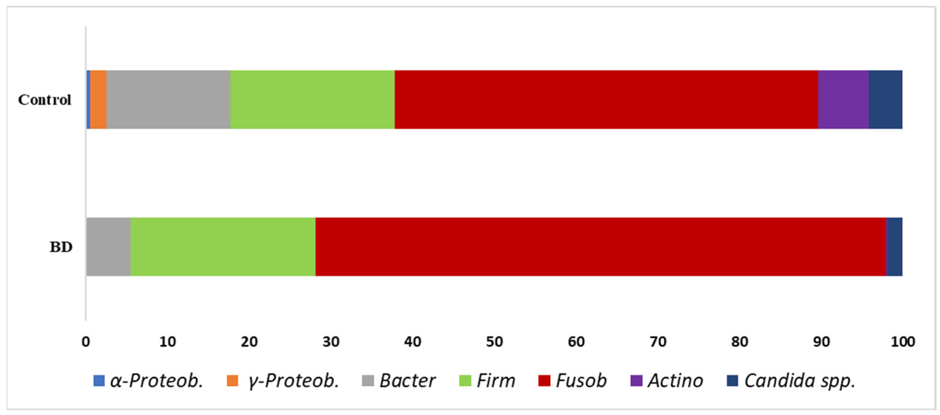 - Malan-Müller, S.; Vidal, R.; O’Shea, E.; Montero, E.; Figuero, E.; Zorrilla, I.; de Diego-Adeliño, J.; Cano, M.; García-Portilla, M.P.; González-Pinto, A.; et al. Probing the Oral-Brain Connection: Oral Microbiome Patterns in a Large Community Cohort with Anxiety, Depression, and Trauma Symptoms, and Periodontal Outcomes. Transl. Psychiatry 2024, 14, 419. [Google Scholar] [CrossRef]