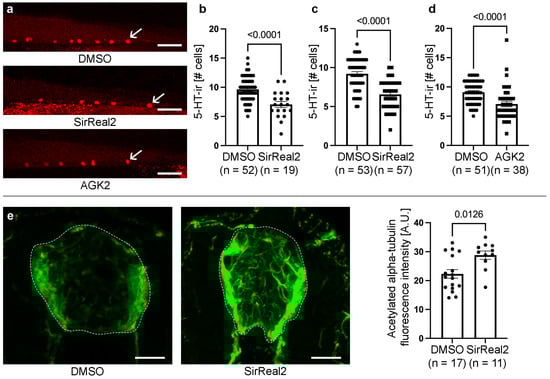 Inhibition of SIRT2 reduces the generation of serotonergic cells in the developing spinal cord. (a) Representative photomicrographs of 4 dpf zebrafish showing the reduction in serotonin-immunoreactive cells (arrows) in the caudal spinal cord of SirReal2- or AGK2-treated animals as compared to DMSO controls. (b) Graph showing the reduction in the number of serotonin-immunoreactive cells observed in SirReal2-treated animals in the secondary drug screen. (c) Graph showing the reduction in the number of serotonin-immunoreactive cells observed in SirReal2-treated animals (newly purchased; not from the drug library) as compared to DMSO controls. (d) Graph showing the reduction in the number of serotonin-immunoreactive cells observed in AGK2-treated animals as compared to DMSO controls. (e) The SirReal2 treatment increases the intensity of acetylated alpha-tubulin immunofluorescence in the spinal cord of 3 dpf zebrafish. Photomicrographs show acetylated alpha-tubulin immunofluorescence in cryostat spinal cord sections (dotted lines) of DMSO controls and SirReal2-treated 3 dpf larvae. Dorsal is at the top in all photomicrographs. Scale bars: (a) 25 µm; (e) 15 µm.