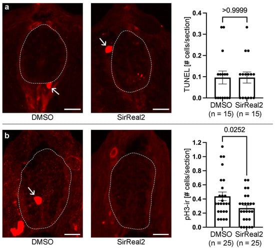 To determine the cellular mechanisms by which SIRT2 promotes neurogenesis, we analysed the effect of the SirReal2 treatment on apoptotic cell death and mitotic activity in the spinal cord of 3 dpf zebrafish. We did not observe a significant difference in the (very low) number of TUNEL+ (apoptotic) cells in the spinal cord between DMSO controls and SirReal2-treated 3 dpf zebrafish (Figure 3a). This indicates the following: (1) SIRT2 inhibition does not reduce neurogenesis by causing an increase in apoptotic cell death; (2) SIRT2 does not promote neurogenesis by promoting the survival of progenitor cells or differentiating/differentiated neurons. However, we found a significant decrease in mitotic activity (reduced numbers of pH3+ cells) in the spinal cord of SirReal2-treated animals as compared to DMSO controls (Figure 3b). These results indicate that SIRT2 promotes neurogenesis, at least in part, by promoting mitotic activity in progenitor cells.