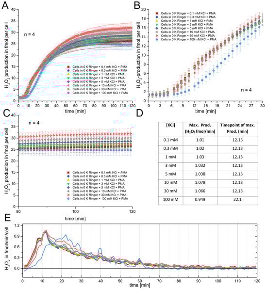Respiratory burst (RB) measurement under several KCl concentrations. (A) Recording over 2 h started by the application of 120 nM PMA. Each KCl concentration in Ringer solution is depicted. The data points are the mean; the error bars are ± SD, n = 4. (B) Magnification of the first 30 min of the experiments. The delay introduced by 100 mM KCl is clearly visible; error bars are SD. (C) The final 40 min of the experiments showing almost unanimous behavior of the cells, depicted as the mean and SD. (D) Table showing the maximal production per cell of H2O2 and at which time point it was detected. The delay at 100 mM KCl is also visible. (E) The mean rate of H2O2 production plotted against the time; colors represent ionic concentrations as in panel (A).