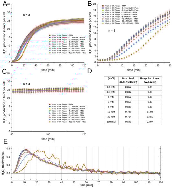 Respiratory burst (RB) measurement under several NaCl concentrations. (A) Recording over 2 h started by the application of 120 nM PMA. Each NaCl concentration in Ringer solution is depicted. The data points are the mean and the error bars are SE, n = 3. (B) Magnification of the starting 30 min of the experiments. The delay introduced by 100 mM NaCl is clearly visible, and the error bars are SE. (C) The final 40 min of the experiments showing almost unanimous behavior of the cells, depicted as the mean and SE. (D) Table showing the maximal production of H2O2 per cell and at which time point it was detected. The delay at 100 mM NaCl is also detectable here. (E) The mean rate of H2O2 production plotted against the time; colors represent ionic concentrations as in panel (A). The delays of H2O2 release are readily visible too.