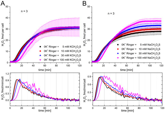 Methanesulfonate, as another anion, does not affect the RB differently to sodium or potassium. RB measurement under several KCH3O3S and NaCH3O3S concentrations. (A) Recording over 2 h started by the application of 120 nM PMA. Each KCH3O3S concentration in Ringer solution is depicted. The data points are depicted as the mean and the error bars are SD, n = 3. (B) Concentrations of NaCH3O3S affect the RB of human granulocytes comparable to KCH3O3S data, depicted as mean ± SE. Below each graph, the mean rate of H2O2 release over time is shown; colors represent ionic concentrations as in panels (A,B).