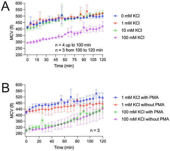 Mean cell volume (MCV in fL) was measured on a Beckman Coulter Z2 particle counter (Beckman Coulter, Krefeld, Germany) based on measured changes in electrical resistance produced by non-conductive particles suspended in an electrolyte solution (Coulter method) using a 100 µm aperture tube. The upper and lower size threshold was set to 15 µm and 5 µm, respectively, and the measured volume of cell suspension per run was 0.5 mL. Calibration for particle size was performed with 10 µm Flow-Check fluorospheres (Beckman–Coulter). Data were analyzed with the Multisizer Software Ver.3.01a (Beckman–Coulter) using a 100 fL cutoff to exclude cell debris. Different samples were alternately measured in 5 min intervals from time point 0 (addition of PMA) up to 120 min, or at time points 0, 10, 20, and 40 min. Cell densities were 3–7 × 106 cells/mL