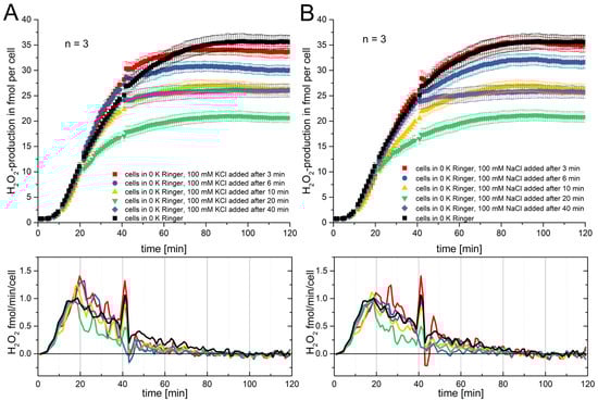 The time-dependence of the RB was investigated by applying 100 mM potassium chloride or sodium chloride at distinct time points during the RB measurement. Figure 5 displays these measurements. In the experiments shown in Figure 5A, the RB was started in all wells in 0 K+ Ringer. Then, at 3, 6, 10, 20, and 40 min, 100 mM of potassium chloride was added. The addition at 3 and 6 min did not affect the RB visually. It did not change the H2O2 production remarkably in the first 20 min, and even up to 40 min, there are only miniscule differences. The addition at 10 min shows a slight reduction in H2O2 after 20 min. However, at the first 20 min, there is no visible effect. Yet the addition of potassium chloride at 20 min immediately impacts the RB. The production of H2O2 fully ceases in the next 20 min by showing a markedly decreased slope between 20 and 40 min. A comparable event is seen at the application at 40 min (purple trace), where the H2O2 production instantaneously stops. In Figure 5B, comparable effects in sodium chloride are measured to those seen in the potassium chloride recordings. Once more, the exchange of the monovalent cation does not strongly affect the result. There is variability in the final values of the H2O2 production, but other than that, the data is consistent. In both Figure 5A and Figure 5B, short breaks are detectable which correspond to the time points of the application of hypertonic solution. For both cations, an abrupt stop in H2O2 production is observed after applying the solution at 40 min. After 20 min, the effect on cumulative production is the strongest. Early application affects the RB little. One would hypothesize that the RB has a stable timeframe of about 10 min which is resistant against osmotic shock, while within a second time frame, the RB is vulnerable. An additional unexpected finding was that applying 100 mM potassium chloride or sodium chloride either during or before the RB produced different effects. When applied before the RB, it delayed RB onset (Figure 1 and Figure 2). However, when applied during the RB, 100 mM had no effect for approximately 10 min (Figure 5A,B; all lines except green, yellow, and purple). Thus, the ongoing RB appears resistant to osmotic disturbances.