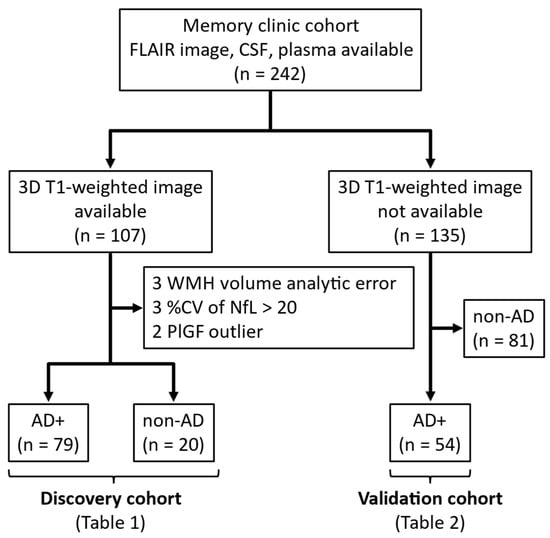 Of the 107 patients with 3D-T1 images, 3 patients with WMH volume analytic error, 3 patients with low quality (intra-coefficient of variation > 20%) of CSF NfL, and 2 patients with outliers of plasma PlGF were excluded. The remaining 99 patients were included in the discovery cohort, of whom 79 with a clinical diagnosis of MCI [29] or probable AD dementia [30] and a positive CSF Aβ42/Aβ40 ratio (details are described below) were classified as AD+, and 20 with a negative CSF Aβ42/Aβ40 ratio were classified as non-AD, regardless of the clinical diagnosis (Figure 1). Non-AD patients included clinically diagnosed cases of 4 AD, 1 dementia with Lewy bodies, 4 frontotemporal dementia, and 11 idiopathic normal pressure hydrocephalus (iNPH). The clinical diagnostic criteria used in this study have been described in our previous report [31].