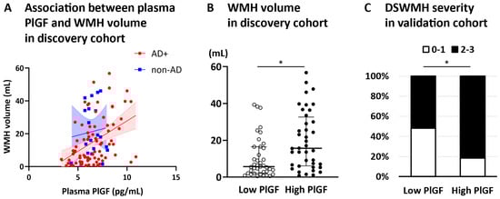 Finally, the AD+ patients in the validation cohort were stratified into two groups according to the PlGF median (6.8 pg/mL). Significantly more patients in the high-PlGF group had a DSWMH grade ≥ 2 than those in the low-PlGF group (p = 0.0418, Figure 2C).