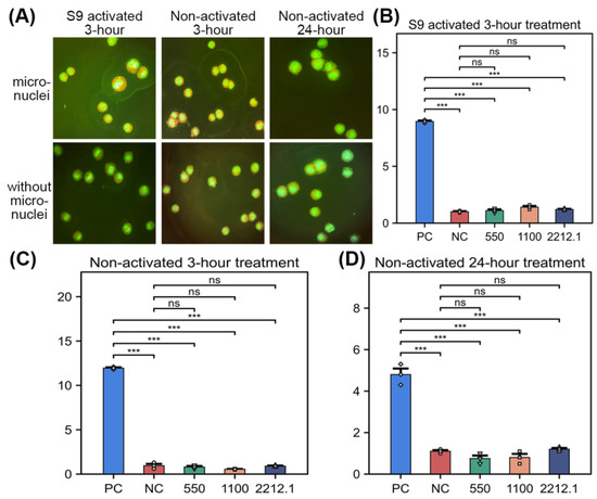 In vitro micronucleus assay in Chinese hamster ovary cells exposed to GlcNAc. (A) The micronucleus assay in Chinese hamster ovary cells with different experimental groups. (B–D) The ratio of micronucleated cells with S9-activated 3 h treatment (B), non-activated 3 h treatment (C), and non-activated 24 h treatment (D). A two-tailed Welch’s t-test was used to compare means between two independent groups, *** p < 0.001. ns, not significant (p > 0.05).