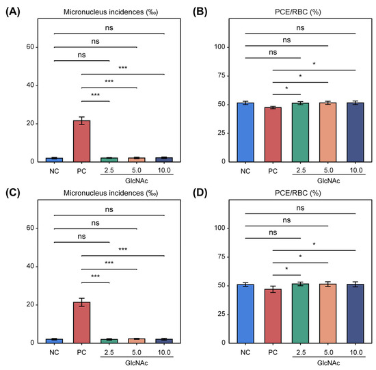 Effects of GlcNAc on micronucleus formation and PCE/RBC ratio in mice. (A) Micronucleus incidence in female mice. (B) PCE/RBC ratio in female mice. (C) Micronucleus incidence in male mice. (D) PCE/RBC ratio in male mice. Data are expressed as mean ± SD. Two-tailed Welch’s t-test was used to compare means between two independent groups. * p < 0.05; *** p < 0.001. NC: negative control; PC: positive control, treated with cyclophosphamide (40 mg/kg). PCEs: polychromatic erythrocytes; RBCs: total red blood cells. For each mouse, total of 10,000 PCEs were scored for micronuclei. ns, not significant (p > 0.05).