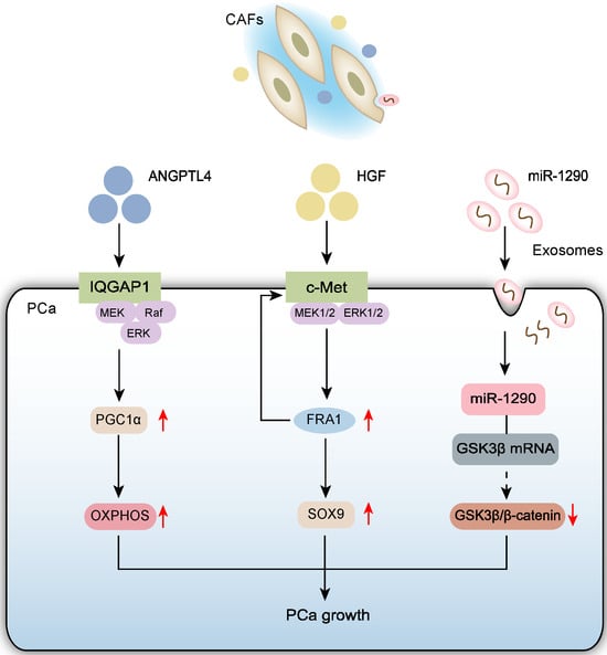Schematic diagram depicts that CAFs drive the progression of PCa through three interconnected mechanisms: (1) ANGPTL4 secretion-mediated activation of the IQGAP1/ERK/PGC1α axis on PCa cell membranes enhancing mitochondrial biogenesis and oxidative phosphorylation function; (2) HGF secretion-triggered signaling that mediates the c-Met/ERK/FRA1 pathway upregulating SOX9 expression to promote tumor growth; (3) Exosomal miR-1290 delivery that inhibits the GSK3β/β-catenin signaling pathway in PCa cells.