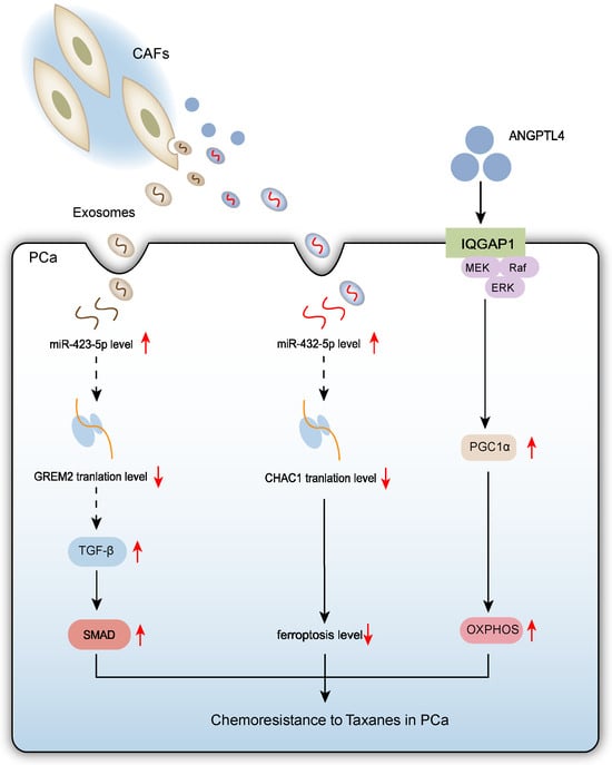 Schematic diagram depicts that CAFs confer taxane resistance in PCa cells through three interconnected mechanisms: (1) Exosomal miR-423-5p delivery that suppresses the TGF-β/GREM2 signaling axis; (2) Exosomal miR-432-5p-mediated inhibition of ferroptosis by targeting CHAC1; (3) ANGPTL4 secretion-mediated activation of the IQGAP1/ERK/PGC1α axis on PCa cell membranes enhancing mitochondrial OXPHOS function.