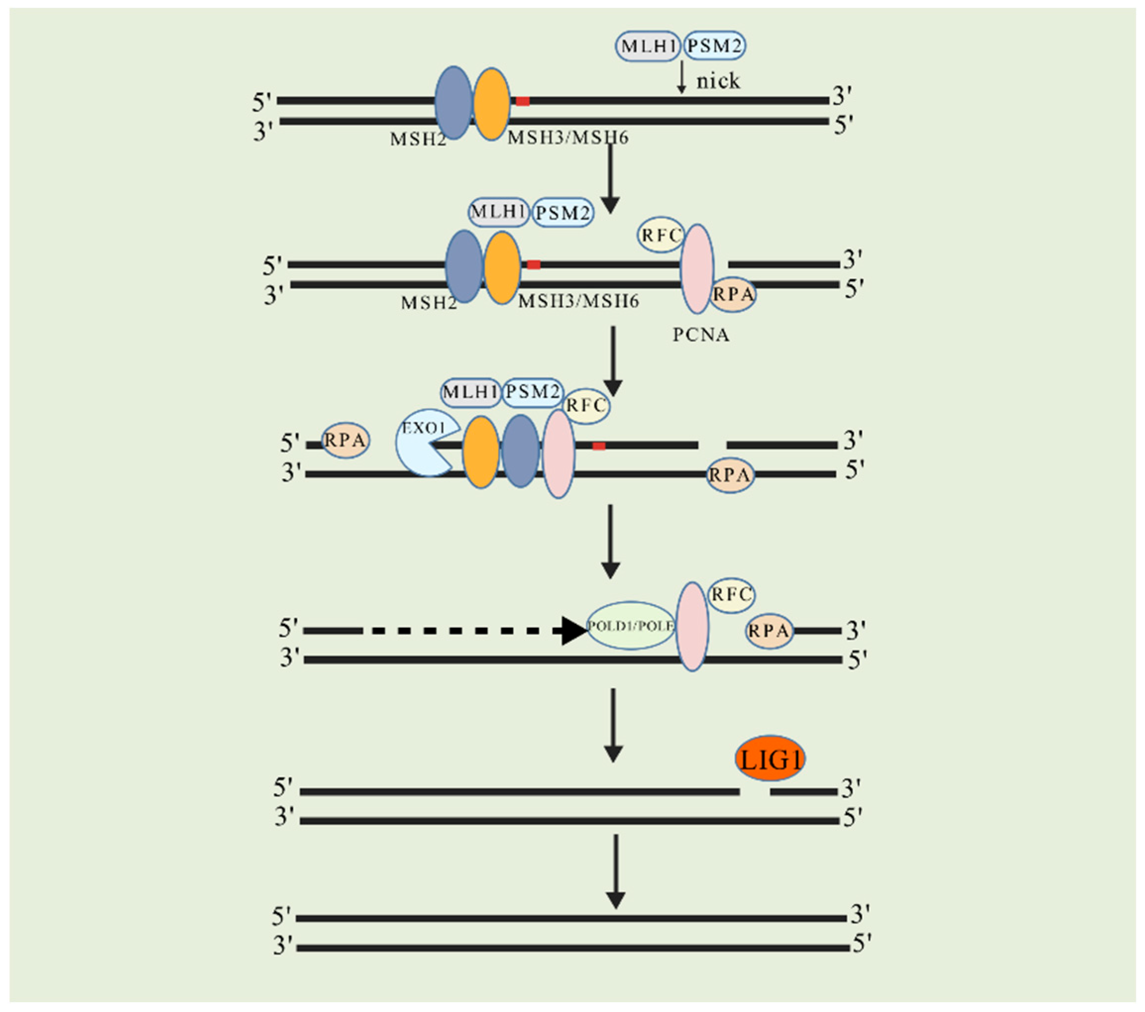 EXO1 | 1q43 | Participate in the MMR resection step to promote the formation of mismatched directional gap [39]. | Germline mutation | - | - |