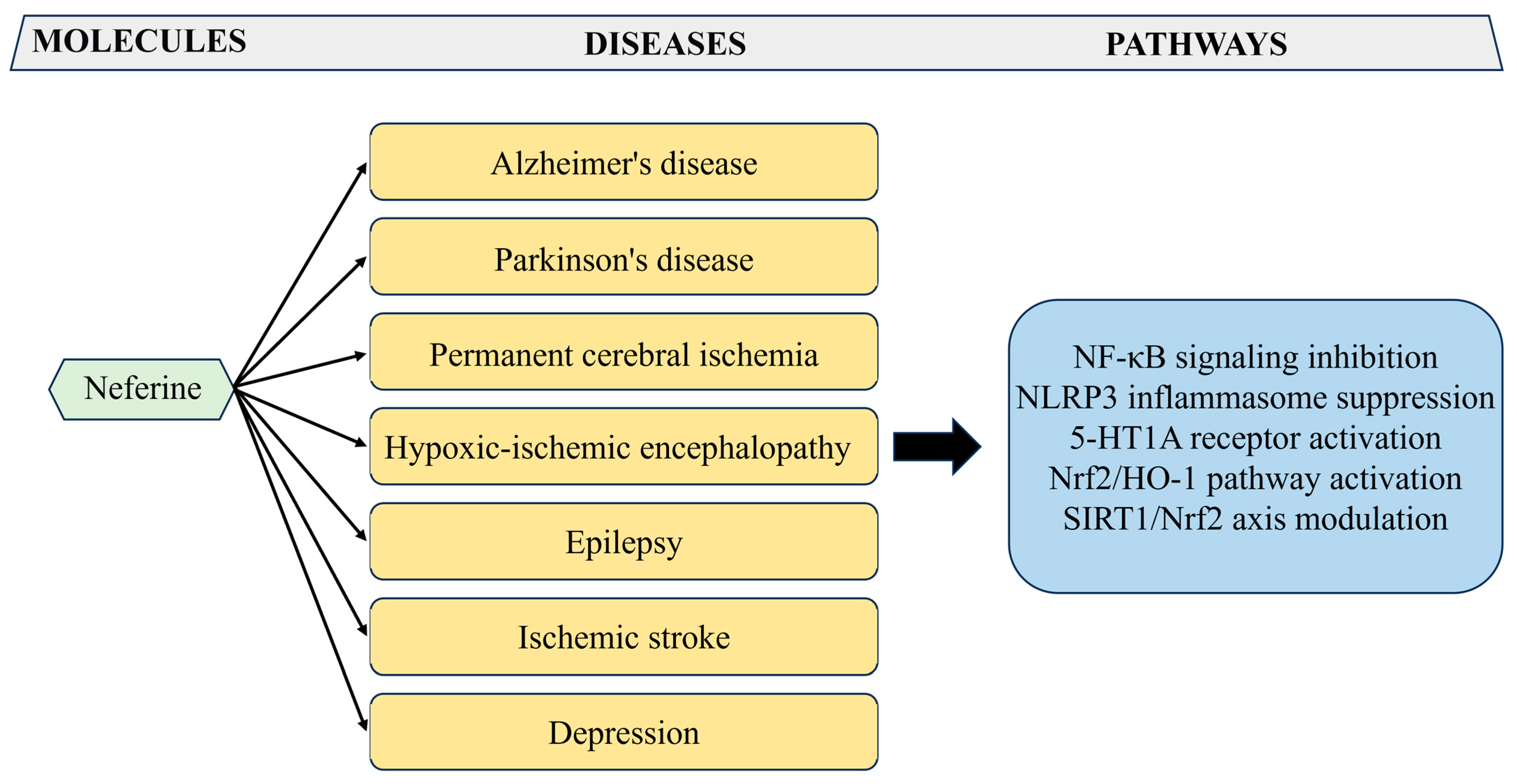 - Yeh, K.C.; Hung, C.F.; Lin, Y.F.; Chang, C.; Pai, M.S.; Wang, S.J. Neferine, a bisbenzylisoquinoline alkaloid of Nelumbo nucifera, inhibits glutamate release in rat cerebrocortical nerve terminals through 5-HT(1A) receptors. Eur. J. Pharmacol. 2020, 889, 173589. [Google Scholar] [CrossRef]