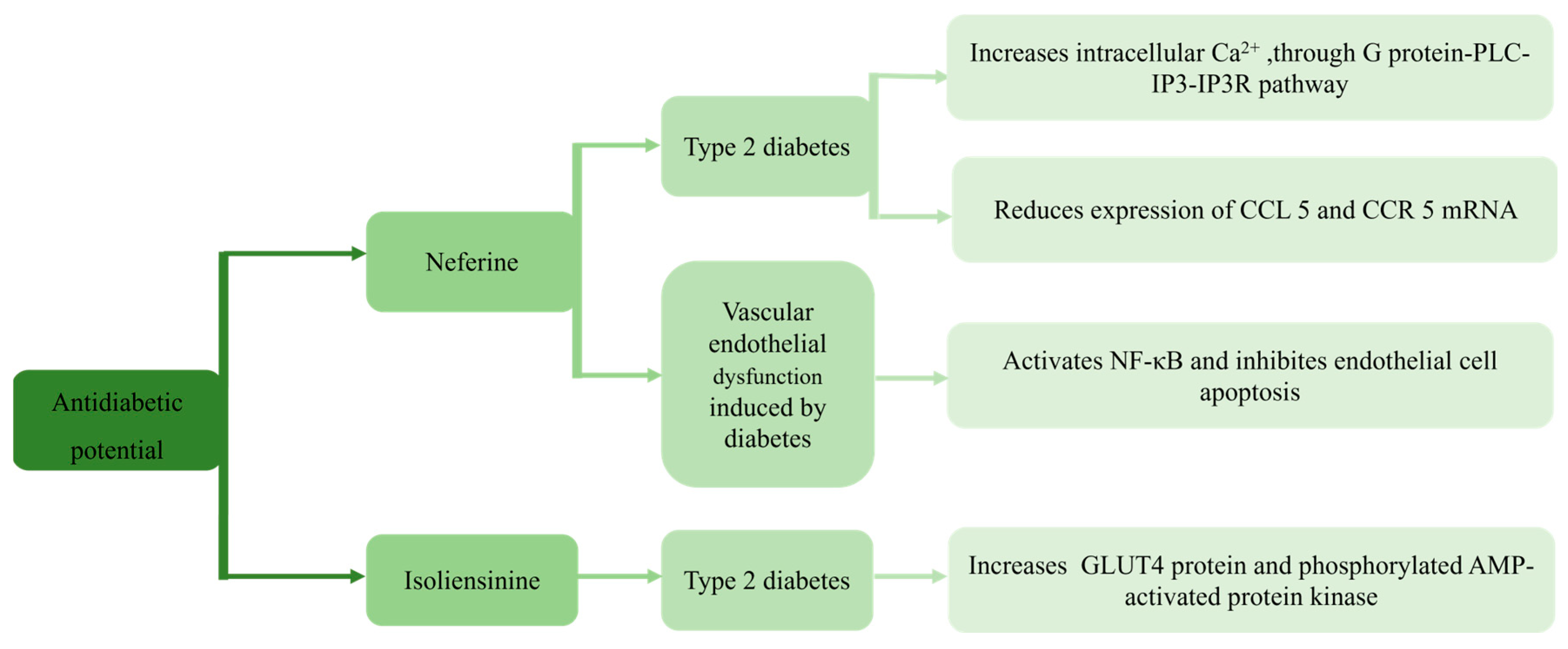 - Bharathi Priya, L.; Huang, C.Y.; Hu, R.M.; Balasubramanian, B.; Baskaran, R. An updated review on pharmacological properties of neferine-A bisbenzylisoquinoline alkaloid from Nelumbo nucifera. J. Food Biochem. 2021, 45, e13986. [Google Scholar] [CrossRef] [PubMed]
