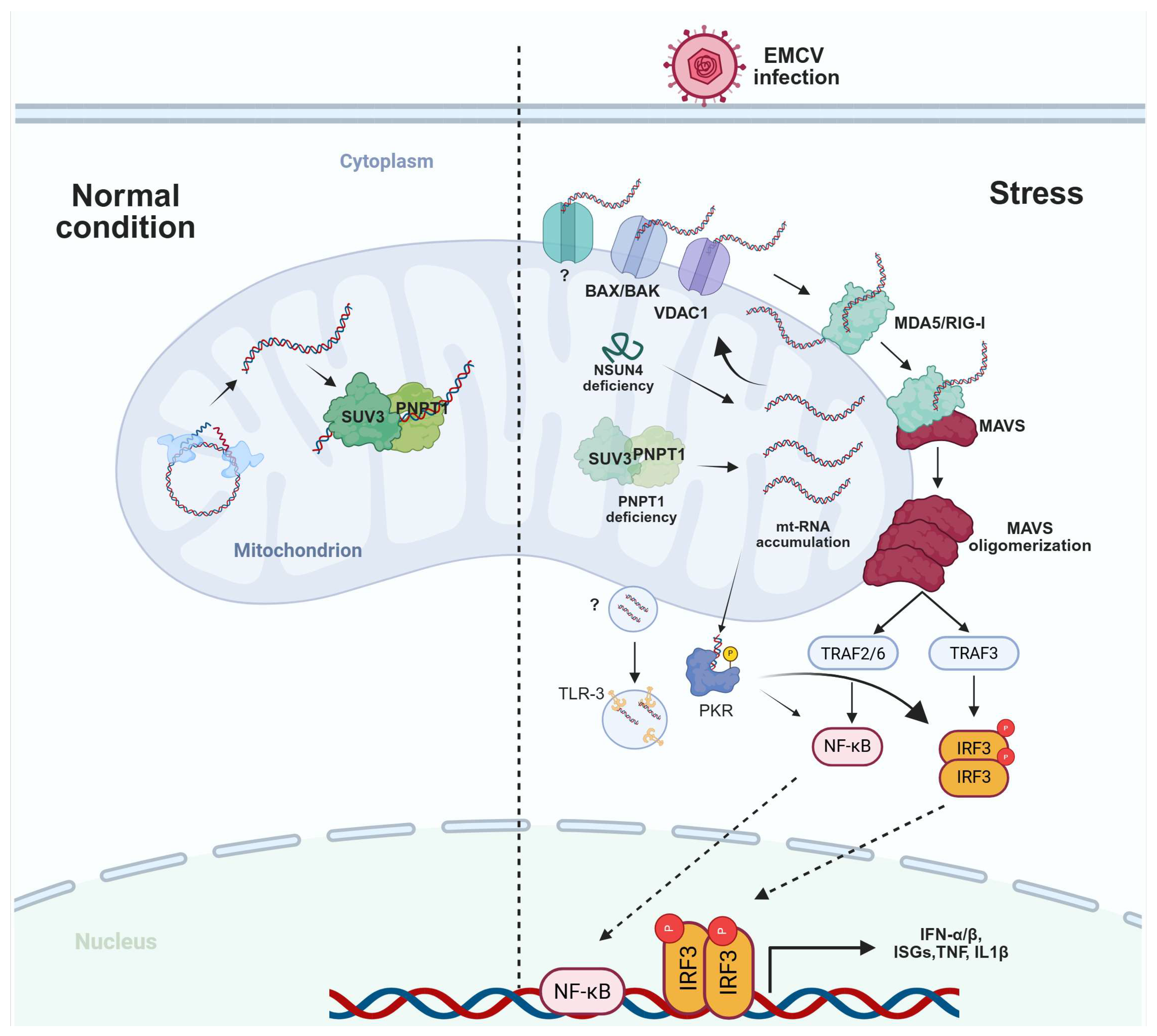 5.2. Abnormal Mitochondrial dsRNA Accumulation Induces Immune Responses