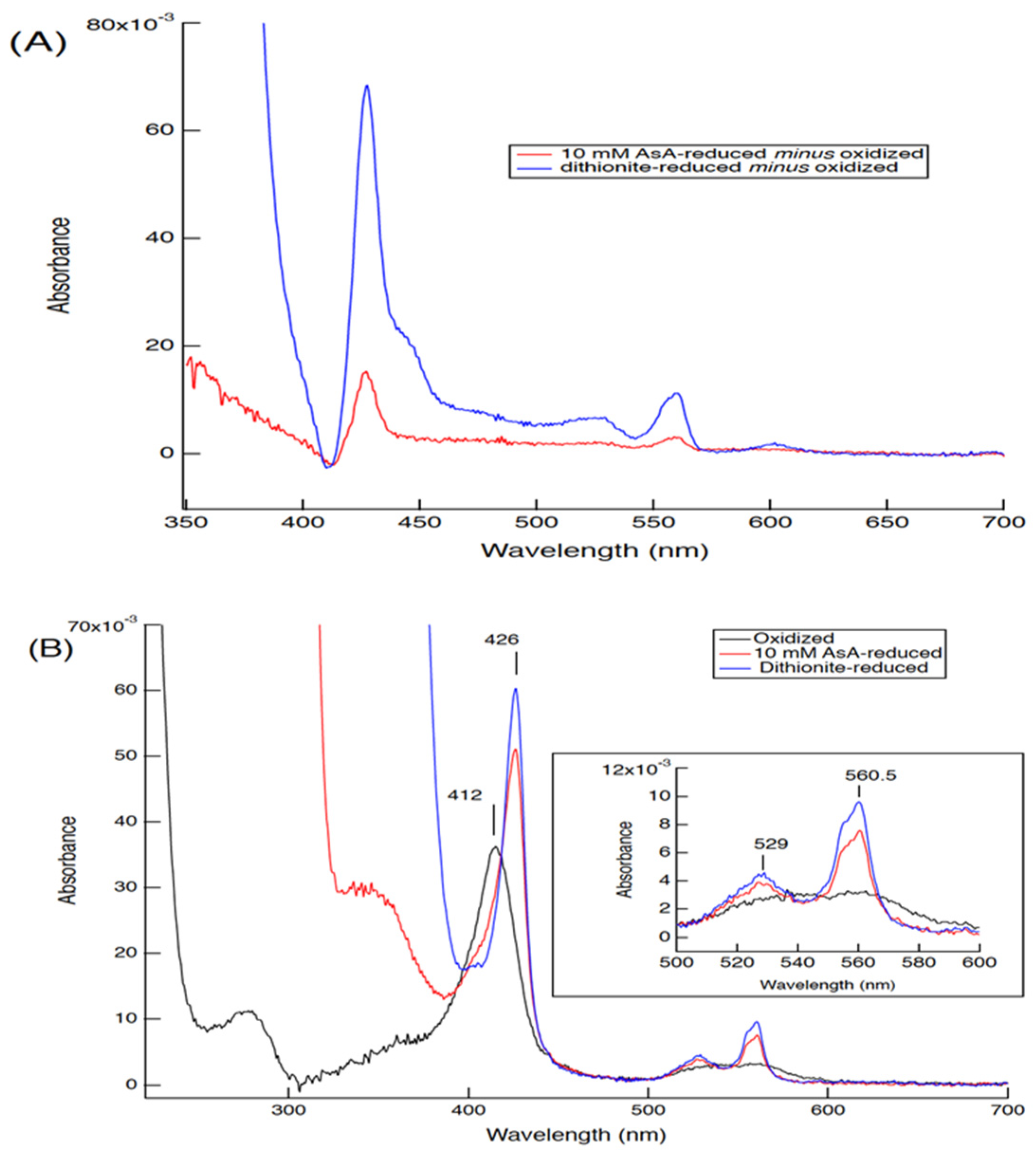- da Silva, G.F.Z.; Shinkarev, V.P.; Kamensky, Y.A.; Palmer, G. Spectroscopic evidence of the role of an axial ligand histidinate in the mechanism of adrenal cytochrome b561. Biochemistry 2012, 51, 8730–8742. [Google Scholar] [CrossRef] [PubMed]