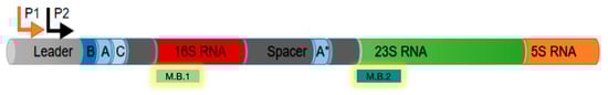 - Brosius, J.; Ullrich, A.; Racker, M.A.; Gray, A.; Dull, T.J.; Gutell, R.R.; Noller, H.F. Construction and fine mapping of recombinant plasmids containing the rrnB ribosomal RNA operon of E. coli. Plasmid 1981, 6, 112–118. [Google Scholar] [CrossRef] [PubMed]