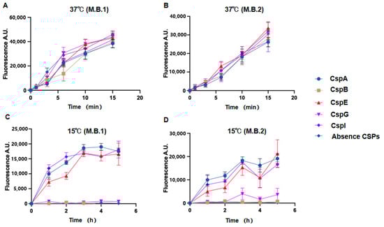 For the quantification of csp mRNAs, wild-type the Escherichia coli BW25113 strain was grown at 37 °C and 15 °C in Luria–Bertani broth, and 5 mL samples were collected when the OD600 reached 0.5. RNA samples were prepared using RNAsio Plus reagent (TaKaRa, Dalian, China) followed by the reverse transcription of RNA according to the cDNA reverse transcription kit from PrimeScript™ RT reagent Kit, (Takara, Dalian, China). Subsequently, a two-step quantitative polymerase chain reaction (qPCR) analysis was conducted utilizing the SYBR® Premix ExTaq kit (TransGen Biotech, Beijing, China).