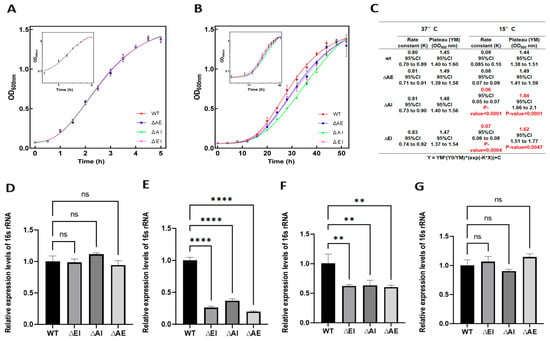 Both wild-type and knockout strains were cultivated at 15 °C or 37 °C in Luria–Bertani (broth). Total RNA was extracted from 5 mL samples taken at a 0.3, 0.5, and 0.8 OD600 from each culture. RNA extraction was performed using the RNAsio Plus reagent (TaKaRa), while the reverse transcription step was carried out using the cDNA reverse transcription kit (PrimeScript™ RT reagent, TaKaRa). Real-time quantitative fluorescence PCR was conducted to quantify 16S RNA (16S-F: AGAGTTGATCGTCAG; 16S-R: GGTTACCTTGTTACGACTT) and the reference mRNA gapA encoding the GAPDH enzyme (F: GAAATTCTTGGGCGAATACA; R: CTTTCACCTCGGAAAAGACG) using the TransScript® Green One-Step qRT-PCR SuperMix (Transgen Biotech) with the Agilent Mx3000P instrument. The qPCR reaction program consisted of 40 cycles: pre-denaturation at 94 °C for 30 s, denaturation at 94 °C for 5 s, and annealing at 60 °C for 30 s. Each experiment was repeated 3 times. Changes in gene expression levels were measured using the 2-ΔΔCt method.
