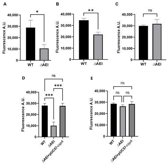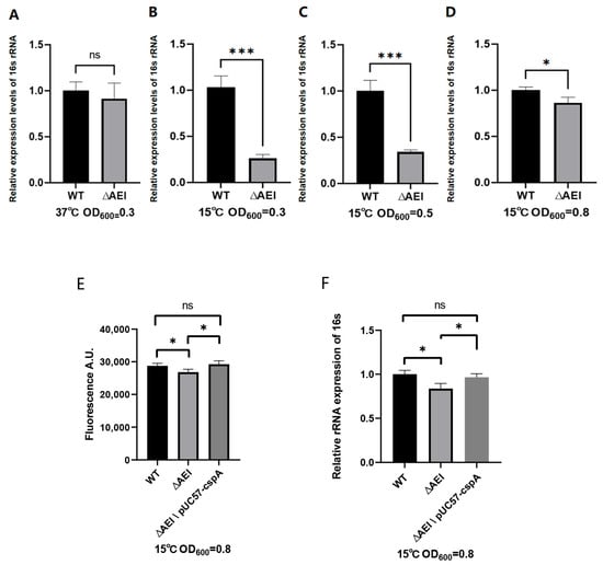 Comparison of the levels of 16S rRNA in wt and triple-gene-deletion cells. The 16S rRNA was quantified via real time PCR based on total RNA extracted when cells had reached OD600 = 0.3 at 37 °C (A) or 15 °C (B). Panels (C,D) show the 16S rRNA levels detected in cells grown at 15 °C up to OD600 = 0.5 and 0.8, respectively. Panels (E,F) show the 16S rRNA levels detected in cells grown at 15 °C to OD600 = 0.3 and 0.8, respectively, when cspA was expressed in the triple mutant. The relative expression refers to the ratio between the amount of 16S rRNA in each strain and that of the wild-type strain, measured using the 2-ΔΔCt method. Error bars indicate the standard deviation calculated from triplicate measurements. Data were analyzed using the Student’s t-test (***: p < 0.001; *: p < 0.05; ns: p > 0.05).