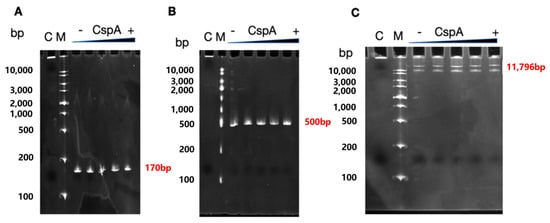 Electrophoretic mobility shift assay (EMSA) of CspA protein binding to rrnB rDNA fragments. (A) A promoter-proximal fragment of rrnB encompassing the P1 and P2 promoters and the initial 35 bp of the transcribed region, the size is 170 bp (B) The 5′-terminal 500 bp fragment of rrnB. (C) The full-length of pKK3535 plasmid the size is 11,796 bp. Lane designations: C, positive control (10 μM H-NS protein); M, DNA marker; “-”, no protein control; “+”, increasing concentrations of CspA protein (0 μM, 2 μM, 5 μM, 10 μM, 25 μM). All DNA fragments were amplified via PCR and used in the reaction at the conc. of 100 ng/μL. Refer to Table S1 for primer sequences. (original images can be found in the supplementary material).