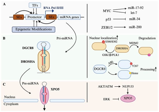 Regulation of miRNA biogenesis in the nucleus. (A) Transcriptional regulation of miRNA genes. Transcription factors (TFs) and super-enhancers (SEs), together with epigenetic modifications, modulate the activity of RNA polymerase II/III at miRNA promoters. Representative examples include MYC (induces miR-17–92 cluster and inhibits let-7 family, p53 (induces miR-34), and ZEB1/2 (inhibits miR-200). (B) Regulation of the Microprocessor complex. Pri-miRNAs are processed by DROSHA and its cofactor DGCR8. Representative examples of DROSHA/DGCT8 modifications: DROSHA nuclear localization is enhanced by phosphorylation at S300/S302 via GSK3β/PLK1, whereas MDM2-mediated ubiquitination promotes its degradation. DGCR8 activity is regulated by ABL-mediated phosphorylation at Y267 and heme binding, both of which promote pri-miRNA processing. (C) Nuclear export of pre-miRNAs. Exportin-5 (XPO5) transports pre-miRNAs from the nucleus to the cytoplasm. Representative examples of XPO5 regulation: XPO5 function is regulated by signaling pathways, including AKT/ATM via NUP153 and ERK-mediated phosphorylation.