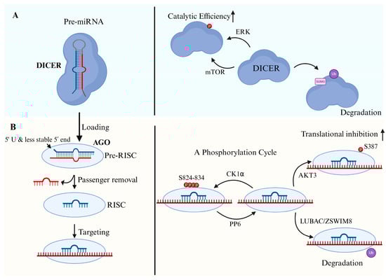 Regulation of miRNA biogenesis in the cytoplasm. (A) Regulation of DICER. Pre-miRNAs are processed by DICER to generate mature miRNA duplexes. DICER catalytic efficiency is enhanced by ERK- and mTOR-mediated phosphorylation. Conversely, post-translational modifications such as SUMOylation and ubiquitination promote DICER degradation, reducing miRNA processing capacity. (B) Regulation of AGO and RISC assembly. After DICER cleavage, duplex miRNAs are loaded onto AGO to form a pre-RISC. AGO preferentially selects the strand with a 5′ uridine and the less stable 5′ end as the guide strand. Subsequent removal of the passenger strand generates a mature RISC competent for target recognition. AGO function is dynamically regulated by post-translational modifications: (i) a CK1α–PP6 phosphorylation cycle at residues S824–834 controls target interaction and RISC remodeling; (ii) AKT3-mediated phosphorylation at S387 enhances miRNA-mediated translational inhibition; and (iii) ubiquitination mediated by LUBAC or ZSWIM8 promotes AGO degradation, reducing miRNA silencing activity.