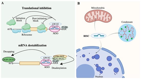 In mammalian cells, miRNAs primarily function to repress gene expression by guiding RISC to partially complementary sequences typically located in the 3′ untranslated region (UTR) of target mRNAs [8,109]. This targeting leads to translational inhibition and mRNA destabilization, two intertwined mechanisms that together reduce protein output effectively (Figure 3A).