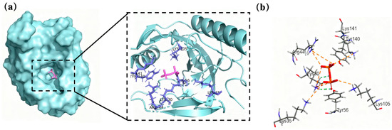 Figure 1. Molecular docking results. (a) Docking results for Ton1914 with a pyrophosphate molecule and (b) the interaction between them (the protein is blue and the pyrophosphate is purple).