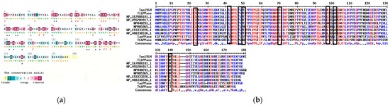 Figure 2. Ton1914 sequence analysis. (a) Ton1914 conservation analysis: e—amino acid residues exposed on the protein surface; b—amino acid residues buried within the protein structure; f—predicted functional amino acid residues; s—predicted structural amino acid residues. (b) A comparison of the amino acid sequence of Ton1914 with those of inorganic pyrophosphorylases derived from other thermophilic bacteria and inorganic pyrophosphorylases within the same family with a homology of 60–80%, with selected mutation sites in black boxes. In the sequence alignment results, amino acids with low conservation are represented by black letters, those with high conservation by blue letters, and completely conserved amino acids by red letters.