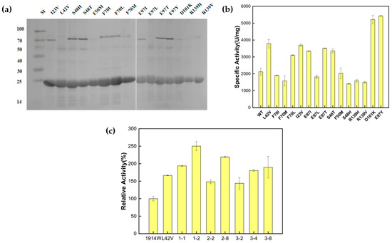 Figure 3. Results of construction, expression and enzyme activity determination of Ton1914 and its single mutants: (a) Expression of single mutants. Protein expression levels (mg/mL), left to right: 0.613, 0.593, 0.67, 0.476, 0.494, 0.724, 0.683, 0.592, 0.638, 0.611, 0.607, 0.587, 0.672, 0.358, 0.545; (b) enzyme activity of single mutants; (c) saturation mutation results for mutant L42V, in which mutations numbered 1-1, 1-2 and 2-8 were confirmed by sequencing to be L42W, L42F and L42C, respectively. (All assays were performed in triplicate, and the standard deviations of the biological replicates are represented by error bars).