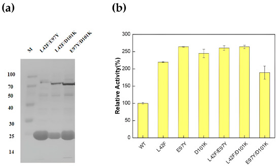 According to the saturation mutation results, three double mutants, L42F/E97Y, L42F/D101K and E97Y/D101K, were chosen to further explore their enzyme activity. After their successful construction and expression (Figure 4a), the L42F/E97Y and L42F/D101K superimposed mutants still maintained high enzyme activity, 2.60- and 2.63-fold that of the wild-type enzyme, respectively. However, the mutant E97Y/D101K, a combination of the two most superior mutants, E97Y and D101K, did not exhibit considerable enzyme activity at 1.88-fold that of the wild-type enzyme (Figure 4b).
