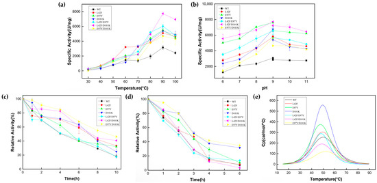 Figure 5. Enzymatic characterization of Ton1914 and its mutants. (a) Results of optimum reaction temperature determination; (b) results of optimal reaction pH determination; (c) stability of enzymes at 80 °C; (d) stability of enzymes at 90 °C; (e) results of thermal stability analysis. (All assays were performed in triplicate; error bars represent the standard deviations of biological replicates).