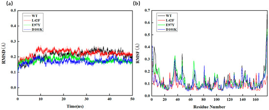 The RMSD results of L42F, E97Y, and D101K were shown in Figure 6. The stability of the L42F showed no significant difference compared to the wild-type enzyme. The RMSD values of E97Y and D101K mutants were lower than that of the wild-type enzyme after 30 ns, indicating that they had more stable conformations. The RMSF value of L42F showed that its structure tended towards being more rigid, so the active pocket of L42F was more stable. L42F’s active site had stronger rigidity to facilitate substrate entry and exit, so its enzyme activity was higher than that of wild-type enzyme. For E97Y, its catalytic active center was more flexible and had a higher probability of contacting substrates and catalyzing reactions. Therefore, its enzyme activity was higher compared to the wild-type enzyme. The RMSF value of the D101K mutant did not indicate a substantial change in flexibility at that specific residue. However, a broader analysis revealed a noticeable reduction in RMSF values across a significant portion of the protein structure. Combined with the decreased global RMSD observed for this mutant, it was proposed that the D101K mutation enhanced the overall rigidity of the enzyme. This interpretation was further supported by the improved thermal stability of the D101K variant, consistent with the RMSD and large-scale RMSF trends. To facilitate clearer interpretation, the RMSD and RMSF results for all mutants have been provided in the Supplementary Materials (Figure S2).