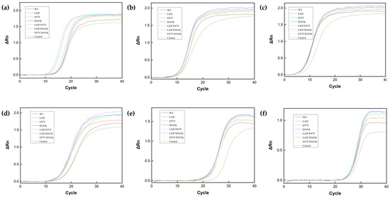 To validate PCR enhancement, six target genes of different lengths were used for qPCR, and the amount of inorganic pyrophosphatase added to the qPCR system was preliminarily optimized (Figure S3). It was found that Ton1914 at 0.7 μg/mL exhibited the best PCR enhancement and that an excessive quantity of PPase affected the PCR amplification efficiency. Therefore, in order to reduce the amount of inorganic pyrophosphatase in the PCR system and its impact on DNA polymerase to promote the reaction, it was necessary to improve the enzyme activity of Ton1914. The results showed that Ton1914 and its mutants reduced the number of qPCR cycles required to reach the threshold and improved the efficiency of gene amplification. Compared to the wild-type enzyme, four mutants, E97Y, D101K, L42F/E97Y and L42F/D101K, significantly enhanced the qPCR (Figure 7a–f).