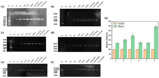 Figure 8. Results demonstrating the effect of Ton1914 and its mutants in enhancing PCR. The lengths of the template genes are (a): 537 bp; (b): 1338 bp; (c): 2106 bp; (d): 2859 bp; (e): 5770 bp; (f): 8137 bp; (g) Enhanced PCR efficiency of mutants compared to Ton1914. For the six template genes of different lengths, the mutants exhibiting the strongest improvement in PCR performance were: (a) L42F/E97Y; (b) E97Y/D101K; (c) D101K; (d) E97Y/D101K; (e) E97Y/D101K; (f) L42F/E97Y. Within each independent group, the yield of its own WT (wild-type enzyme) group was set as 100% for the comparison of relative yields. (All assays were performed in triplicate, and the standard deviations of the biological replicates are represented by error bars).